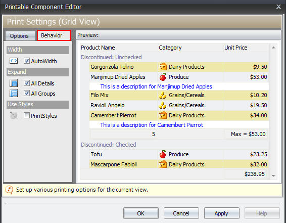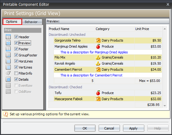 - The Print Preview window displays. Review the table below for customizing the budget options before printing.