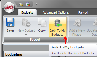 When viewing a specific budget, you may want to view another for comparison or return to the main Budgeting node. To do this, click on the Back To My Budgets button on the Budget tool ribbon.