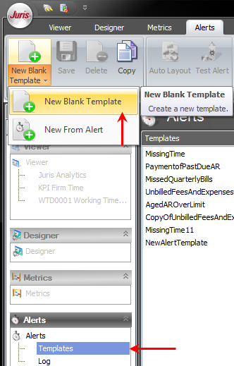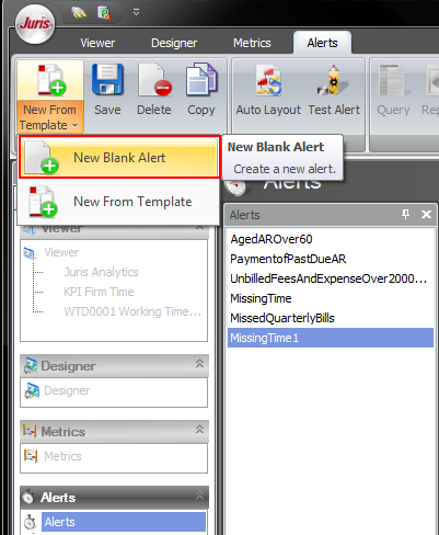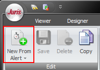 New from Template - This allows you to create an Alert from a Juris Template or user-created Template. You must be on the Alerts selection to have this available.