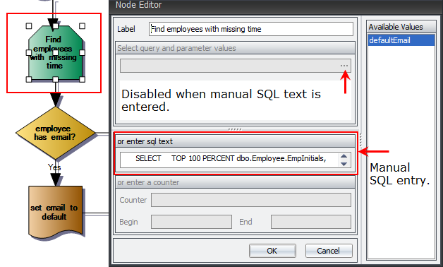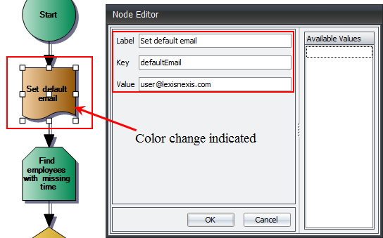 When using a Decision operator, there is more than one possible outcome. There can be a Yes and a No value, depending on the data discovered. The alert flow changes direction based on that value. In this example, if the Employee does NOT have an email address, it is set to the default value. Remember that the default value was set in the Put variable above. If the Employee does have an email address, that email address is used. Both operators after the Decision are Put.