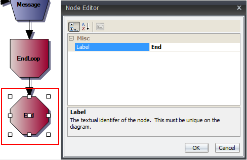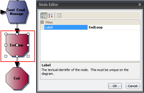Once the action occurs, sending the email(s), the process for finding the Missing Employee Email must be stopped. Since it is defined in the Begin Loop operator, add an End Loop operator to finish the loop. There is only a label property for the End Loop operator.