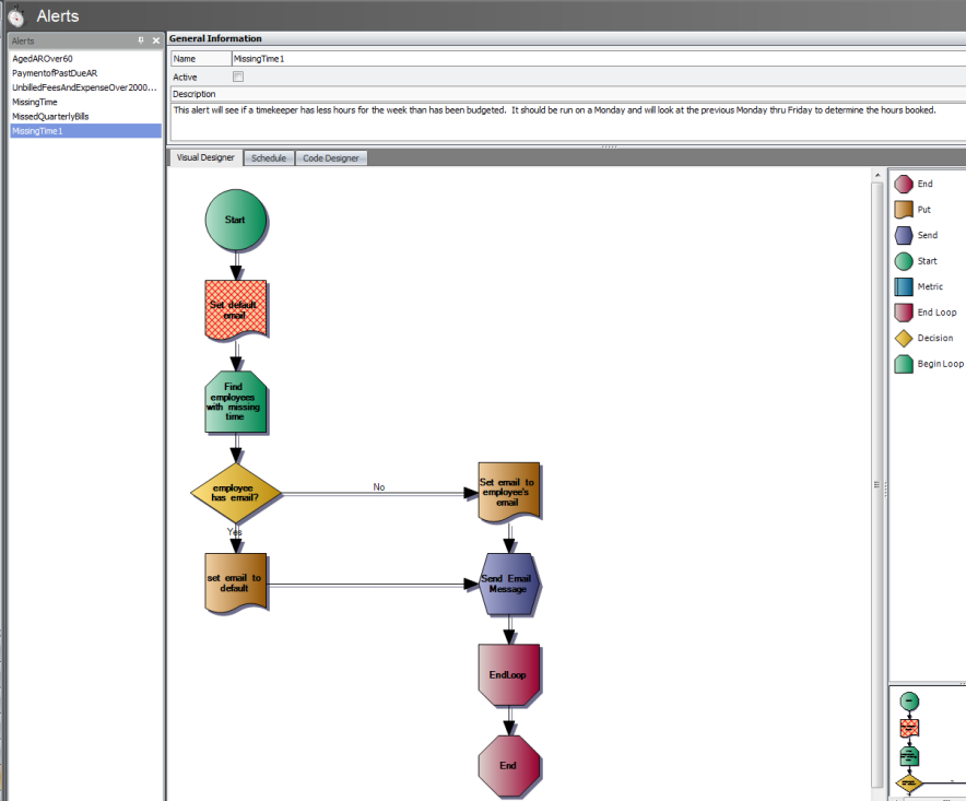 You will need to be familiar with the Alert Operators and their functions. Each alert, whether from a Template or a Blank, must start with a Start operator and end with and End operator. For this example, the Missing Time alert has been selected.