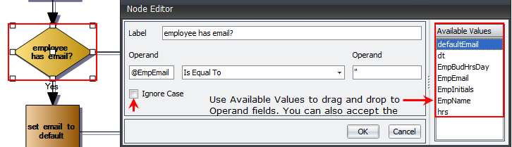 Next in the alert is a Decision operator. This one is for whether the employee has an email. Operands are set by available values from the query or a Put variable. Move the Available Values by dragging and dropping the value to the appropriate field. Depending on the query used, the Available Values can change. Placement depends on the information to be extracted. You can use the Ignore Case check box to make the values not as selective.