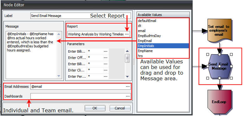 After the decision aspect of the alert has been completed, the action portion of the alert begins. The Send operator performs the task of generating an email and sending the report. It also parses the email using the Available Values selected in the Message area. The report is selected in the Report field (using the ellipses button and Report search function) with the available parameters below it. The Email Addresses field allows you to enter manual email addresses or use the ellipses button to launch your email client's address book, and the Dashboard field is for selecting recipients on a Team level.