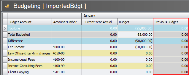 The Previous Budgeted Value function allow you to select a budget from a previous time and add the values to the display grid for comparative purposes. Select the budget you want to add, and click the OK button.