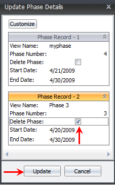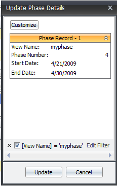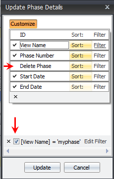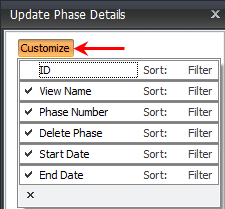 The Customize button lets you change the view within the Update Phase Details window. You can change the Sort and Filter views by toggling them with the Customize list.
