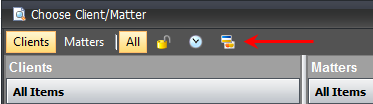 You can utilize the buttons at the top of the Choose/Client Matter window toggle search preferences including: Search by Clients, Search by Matters, Return All Matters (locked and unlocked), Matters that are open, Matters that allow time, and Matters that allow expenses.