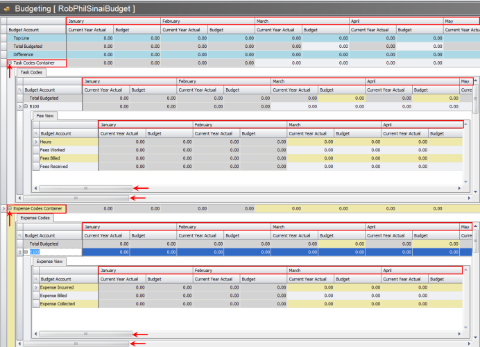 Be aware of the scroll bars within the budget display. Some of the Budget Codes are expanded in the image above. This is performed by clicking on the small plus sign next to the Budget or Expense code. The scroll bars allow you to move throughout the time period to view pertinent information.