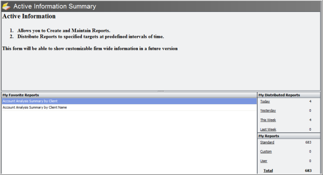 Active Summary is a type of home page that displays a summary of information based on your use and definitions. Currently there a few functions. In future versions of Juris Suite, the display will be customizable.