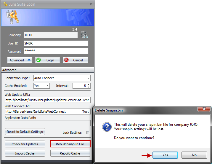 At times, after an update or upgrade, not all of the Juris Suite Snap Ins display properly. The Rebuild Snap In File button helps correct the display problem.