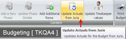 Since budgeting is based on a comparison of actual data versus forecast data or previous time period data, it is necessary to update the real information entered into the Juris database. The Update Actuals from Juris button on the Content tool ribbon performs this task.