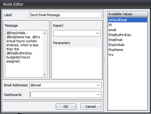 End is a mandatory for each alert or alert template created. This must be used to end the process. The only properties available to the Start operator is the label.