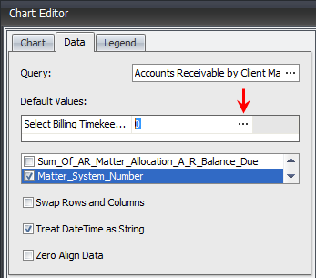 - After you have selected the Query, you have the ability to narrow the query by clicking on the Ellipses button in the Default Values field. In this example, the Query returned the values of Timekeepers. For this example, Ann A. Allen will be selected. Click the OK button after you have made the selection.