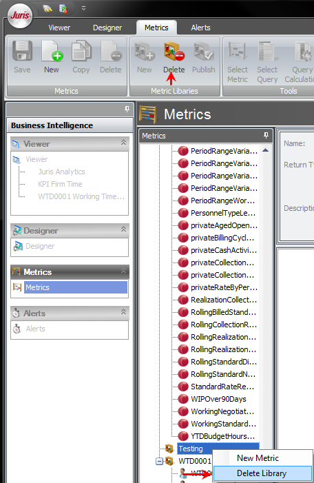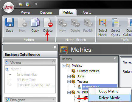 You cannot delete metrics contained in the Juris Metric Library. You can only delete newly created Metrics or copied Metrics.