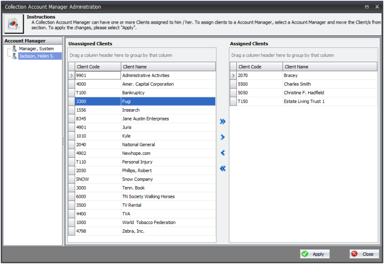 The Account Manager list on the left side of the screen shows all users who have permissions to work with the Collections feature. Highlight a user and assign clients to that user by selecting a client in the Unassigned Clients list and clicking the right arrow button to move the client to the Assigned Clients list.