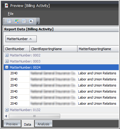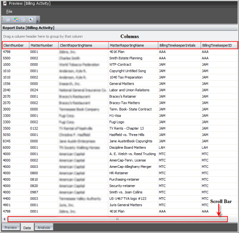 The Data tab of a report allows you to view the raw data associated with the parameters that you have chosen. Like the Preview tab, you can select different values for the parameters of the report to change the displayed information. To utilize the features of the Data tab, perform the following: