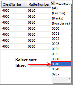 Select the appropriate column header you want to sort. Hover over to the upper right corner until you see the small filter icon.
