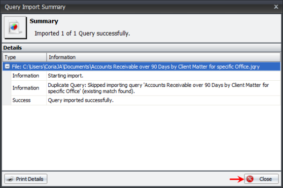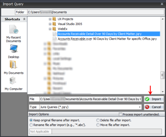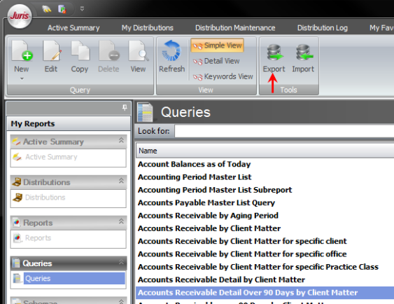 Juris Suite enables you to share Queries by exporting. Another user can then import the query. You can also ImportQueries from the Juris Suite Marketplace Reports and Dashboards page at the Juris Support Center.