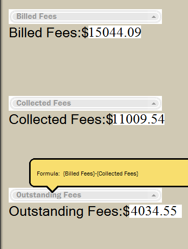 - Misc (For this example, two Metrics on the Dashboard are being used. 'MTDBilledFees' labeled as "Billed Fees" and 'MTDCollectedFees' labeled as "Collected Fees")