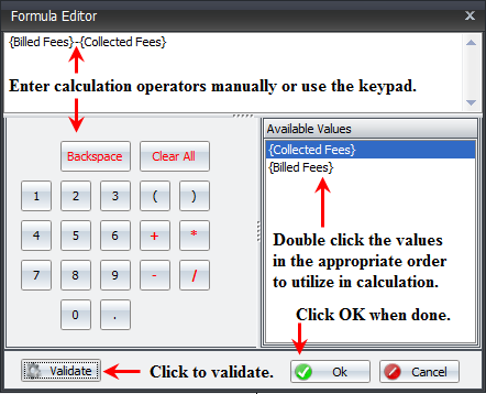 - Use the calculator pad or click inside the calculation area and manually enter the operators. You can ensure the calculation is functional by click the Validate button at any time. A dialog window will appear expressing validation or non-validation. For this example Calculated Fees will be subtracted from Billed Fees.