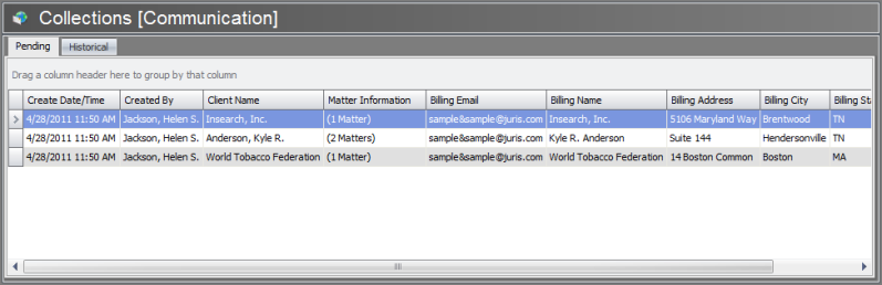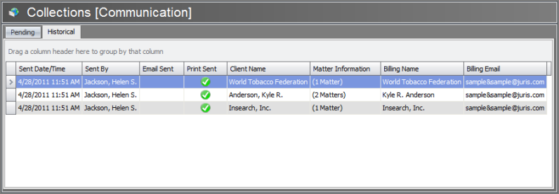 Once a letter has been emailed or printed, it is moved from the Pending tab to the Historical tab. A collection history event is created that details the method used to send the letter.