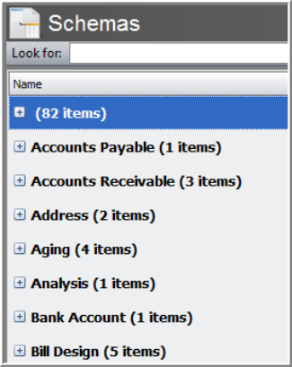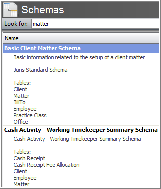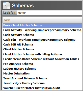 Schemas are visual building blocks comprised of tables. Schemas are used to create queries that build reports. My Reports contains several pre-defined Schemas that can be searched. You can also create new Schemas.