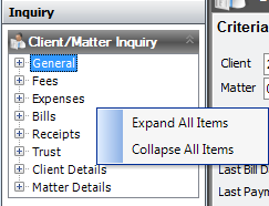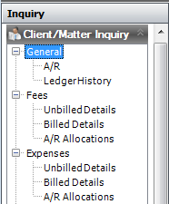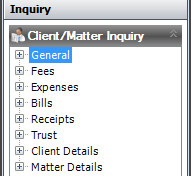 The navigation pane of the Client Matter Inquiry workspace contains 8 different inquiry options which includes: General; Fees; Expense; Bills; Receipts; Trust; Client Details and Matter Details.