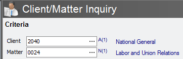 The Criteria section of the Client Matter Inquiry workspace is where you enter the client and matter number you would like to review.