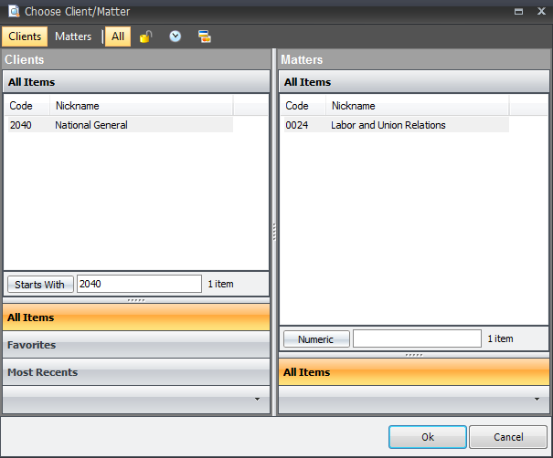 If the client/matter number is unknown you can key in the client name or use the look up feature to search for the client/matter.