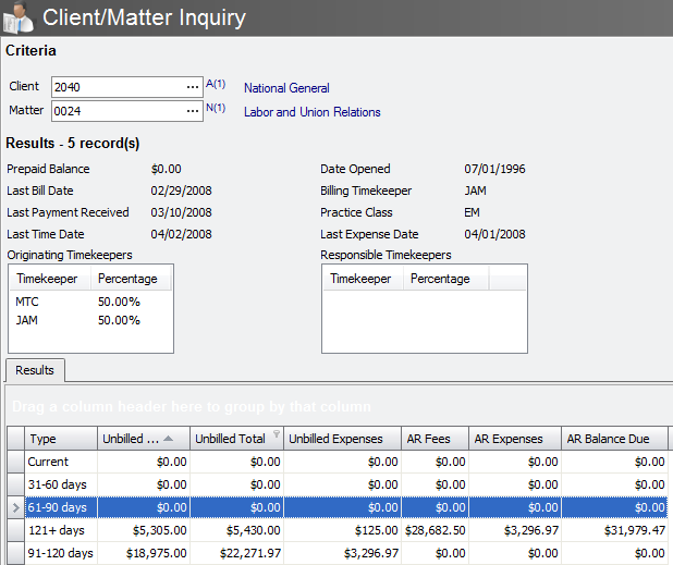 The Results area of the Client Matter Inquiry workspace displays the information requested based on the navigation option selected. Immediately upon entering on a specific client and matter a summary will be displayed.