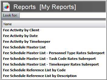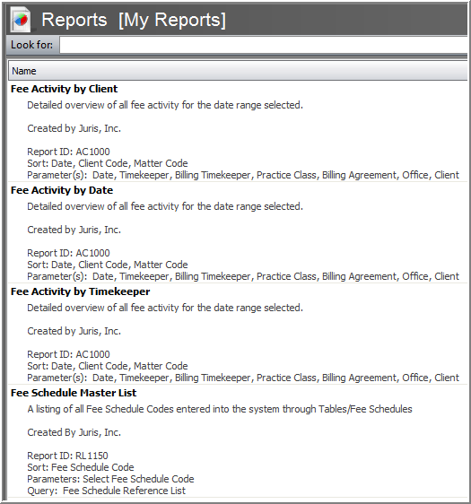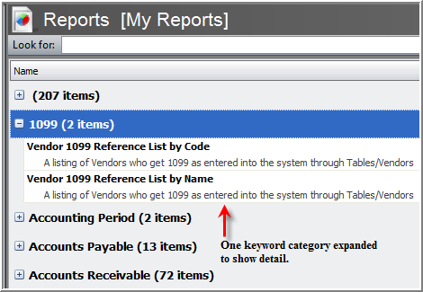 Within each of the views you can search for the appropriate report using the Look for entry field. You can also narrowing the reports by using the alphabetic index on the right side of the report widow.