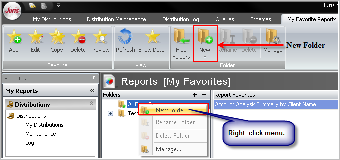 - You can begin creating new folders to store your reports by using the function bar located at the top, or by using the right click menu from an existing folder or the All Favorites folder.