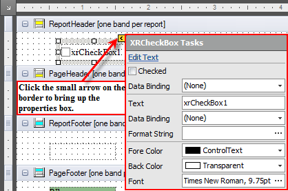 The Designer Tab allows for the amendments to the headers and footers. Each area is clearly marked. There is also Tool Box of Standard Controls, a Report Explorer, and a Property Grid. Each allows the manipulation of settings and additions. Below is the functional list of the Standard Controls.