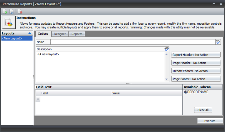 The Field Text area allows you to name field utilized when creating/editing a report and set the value for making a global change. For example, if you have a field labeled FirmName, and the field is present in the reports created, you can enter FirmName in the Field area and enter the new name of the firm in the Value field. You would then set the proper action in the area button listed above to either Add, Update or Replace with the new value. To commit the change, you would click the Execute button located in the lower right hand corner of the window.
