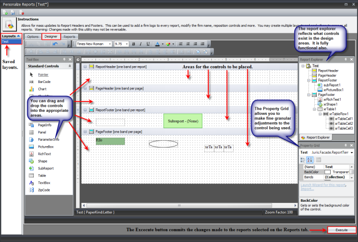 The Designer Tab contains several functions. All of the controls can be dragged and dropped to the design area. Each time a control is placed, the Report Explorer reflects that addition. The Property Grid provides options to edit the controls properties.