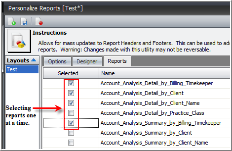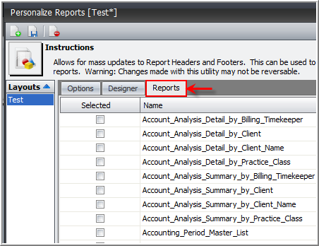 Personalize Reports allows you to perform mass updates to the headers and footers of the reports. This is useful when placing logos, modifying the firm name reposition controls, etc.