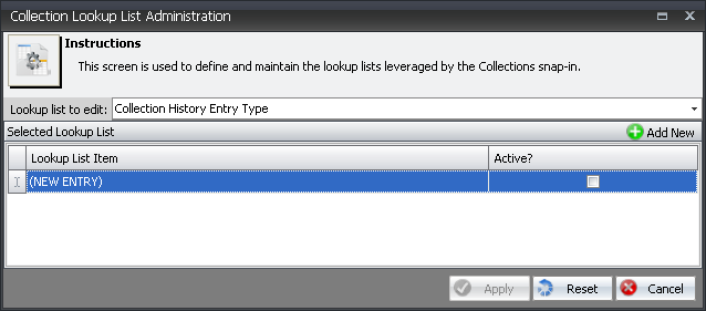 Currently, Collection History Entry Type is the only available lookup list. Once a collection history entry type is defined, you can select it when creating a new collection history event for a Client or Matter.