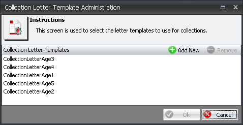 When you have finished adding templates to the Collection Letter Template Administration window, click OK.
