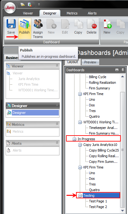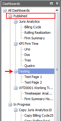 - Select the Dashboard to be published in the In Progress tree node. Remember to select the Dashboard and not the Dashboard Pages.