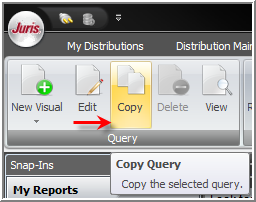 At times it may be necessary to make adjustments to an existing Query. However, you cannot alter existing Query that come with Juris Suite. If you need to make changes to a Juris Suite query or want to make changes to a newly created query but keep the original, use the Copy Query function. To copy a query, perform the following: