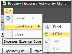 Depending on what tab you are using from the Preview report function, the Export to HTML function can be accessed by a button on the toolbar or via the File menu item.