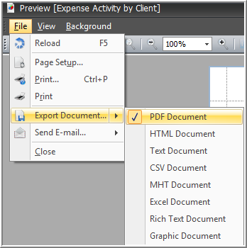Exporting a report to PDF is useful when you want to distribute the report to recipients that do not have access to the reporting function. The PDF format allows anyone with a PC to view the report using the PDF reader program. This could be considered a standard format. To export to a pdf file, perform the following:
