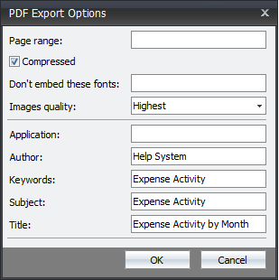 The PDF Export options are for the PDF document features and are NOT directly related to the actual report or the file name. The options are not required. Click the OK button when you have completed making the selections.