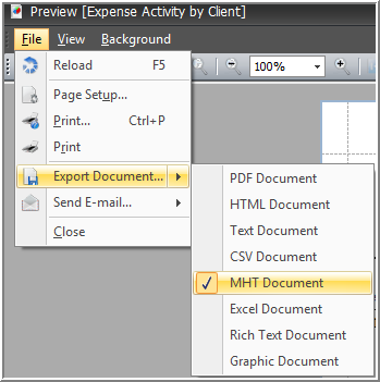 Depending on what tab you are using from the Preview report function, the Export to MHT function can be accessed by a button on the toolbar or via the File menu item.