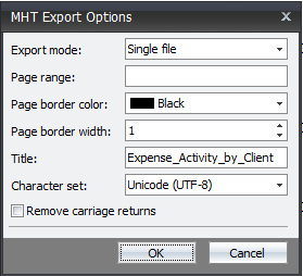 The MHT Export options are for the MHT document features and are NOT directly related to the actual report or the file name. The options are not required. Click the OK button when you have completed making the selections.