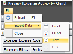 Depending on what tab you are using from the Preview report function, the Export to Text function can be accessed by a button on the toolbar or via the File menu item.