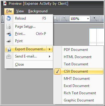 - Depending on what tab you are using from the Preview report function, the Export to Excel function can be accessed by a button on the toolbar or via the File menu item.