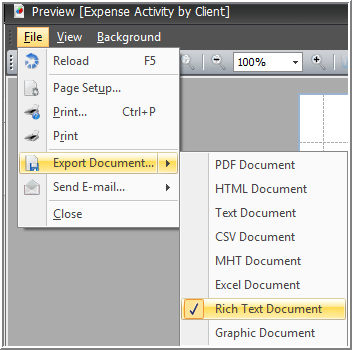 Depending on what tab you are using from the Preview report function, the Export to Rich Text function can be accessed by a button on the toolbar or via the File menu item.