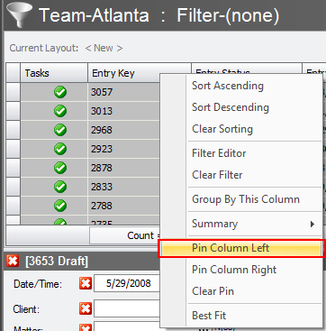 - To remove the Pin function of a column, right click in the display grid and select Clear Pin.