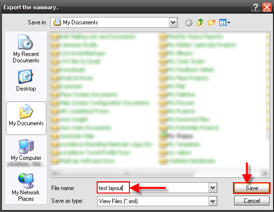 - The Export Summary window will appear prompting you to navigate and name the layout to save. Enter the name in File name field and click the Save button.